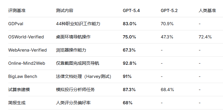 GPT-5.4在OSWorld-Verified中首次超越人类专家平均72.4%的表现,代表AI已具备在真实桌面环境中完成复杂任务的能力