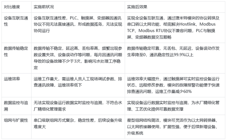 本次污水处理厂欧姆龙CPM1A PLC与触摸屏、变频器的通讯方案,以捷米特JM-ETH-CXD导轨型以太网模块为核心,充分发挥其串口转以太网、以太网转换器、以太网桥接器的多功能优势,有效解决了设备协议不兼容、串口通讯能力不足等核心痛点,成功实现了PLC、触摸屏、变频器的互联互通。方案实施后,显著提升了水厂自动化运行稳定性与运维效率,降低了运营成本,为污水处理厂精细化、智能化管理提供了可靠的通讯支撑。