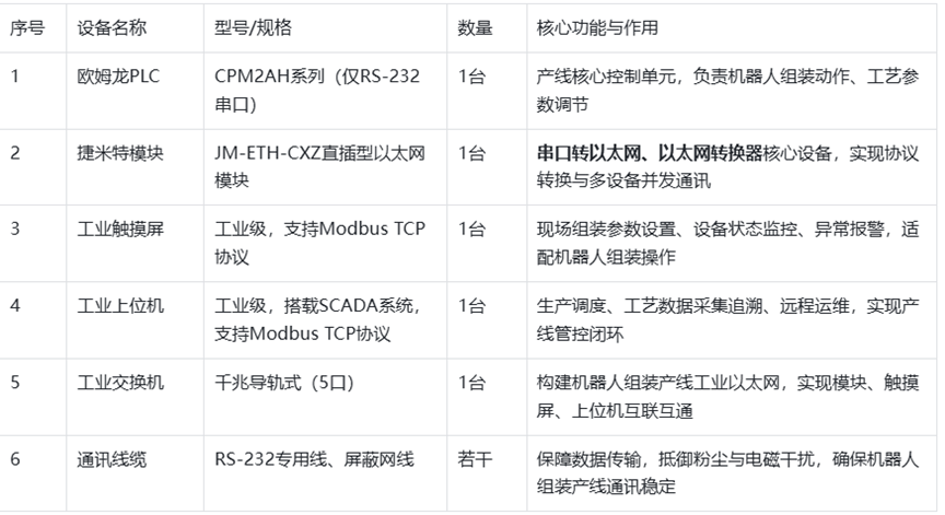 核心控制单元:欧姆龙CPM2AH PLC,仅配备1路RS-232串口,负责机器人组装动作逻辑控制、电池组装参数管控及设备故障报警,通讯协议支持欧姆龙Host Link协议及Modbus RTU协议。