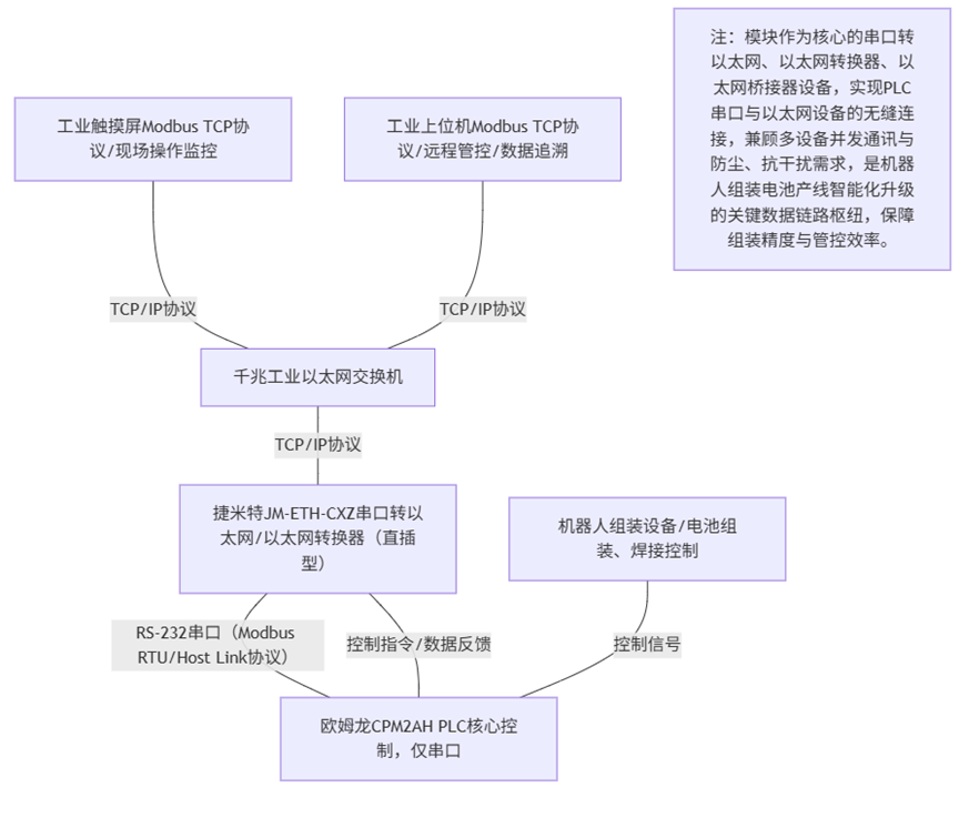 本项目通过引入捷米特JM-ETH-CXZ直插型以太网模块,成功破解了欧姆龙CPM2AH PLC在机器人组装电池产线中面临的协议不兼容、多设备无法并发通讯、抗干扰能力弱、工艺管控粗放等核心痛点。作为关键的串口转以太网、以太网转换器、以太网桥接器设备,该模块凭借其卓越的协议转换能力、多设备并发兼容特性、工业级防护性能及便捷的直插型安装设计,实现了PLC与触摸屏、上位机的无缝通讯,打通了产线数据传输壁垒。