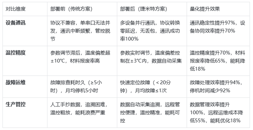 通过捷米特JM-ETH-CXZ直插型模块,实现熔炉温度参数的实时传输、调节与追溯,确保温度控制精度,优化能耗,提升生产效率与管控水平。