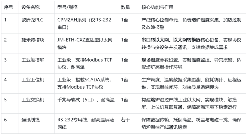 核心控制单元:欧姆龙CPM2AH PLC,仅配备1路RS-232串口,负责熔炉加热管启停、温度传感器数据采集、温控逻辑调节及故障报警,通讯协议支持欧姆龙Host Link协议及Modbus RTU协议,核心管控熔炉温度在1200-1500℃范围内稳定运行。