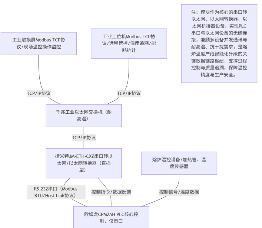 熔炉温度行业涵盖冶金熔炉、工业窑炉、材料合成熔炉等多个应用场景,核心诉求是实现熔炉温度的精准调控(温差误差需控制在±5℃内)、运行状态实时监控及生产数据追溯,同时兼顾能耗优化与生产安全。当前熔炉温度控制企业普遍面临老旧温控设备升级难、温度参数管控滞后、设备协同性差等问题,国家工业节能与绿色发展规划明确要求,推动工业炉窑智能化升级,提升温度控制精度,降低能耗。自动化熔炉温控生产线中,PLC作为核心控制单元,需同时对接现场操作终端(触摸屏)与管控终端(上位机),实现熔炉加热功率、保温时间、温度阈值等参数的精准调节、实时监控及异常预警,保障产品质量与生产安全。欧姆龙CPM2AH PLC凭借高稳定性、强抗干扰性,广泛应用于中小型熔炉温控产线,但该型号仅配备单一串口,无以太网接口,无法适配现代熔炉温控多设备、多协议的通讯需求,成为行业老旧产线改造的共性难题。
