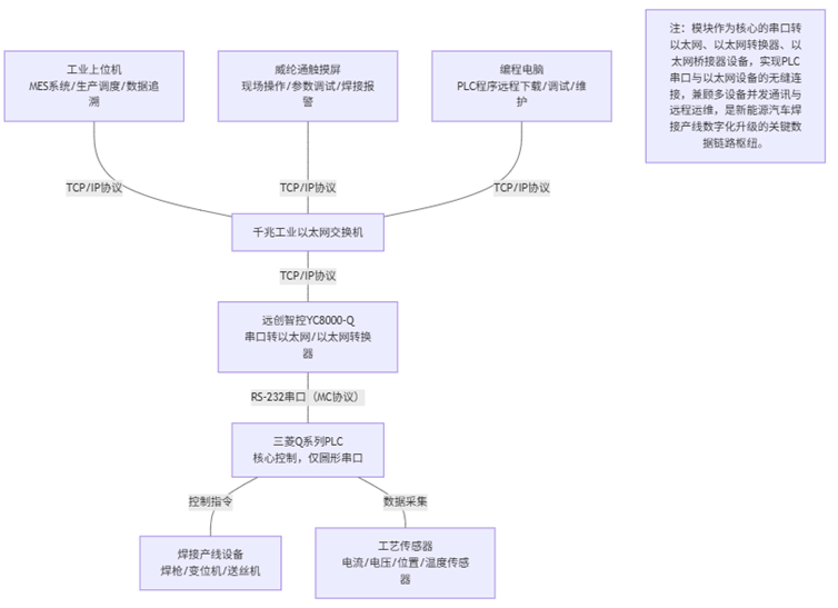 协议与接口双重壁垒,形成数据孤岛:三菱Q系列PLC底层采用RS-232串口与专用MC协议通讯,而触摸屏与上位机MES系统均基于以太网TCP/IP协议体系。串口与以太网协议在数据帧格式、传输机制上存在本质差异,无法直接互联互通。同时,PLC唯一的圆形串口资源无法支撑本地操作、远程管控及程序调试的并发访问需求,导致焊接设备与管控系统各自为战,作业协同效率低下,焊接数据无法实时上传至MES系统。