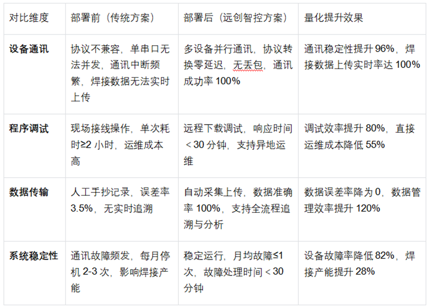 联调测试:通过GX Works2编程软件,借助模块实现PLC程序的远程下载与调试。操作触摸屏,验证焊接参数读写、设备状态监控功能。在上位机MES系统中完成设备添加与通讯配置,测试焊接数据实时采集、远程调度指令下发功能。整个部署与调试周期严格控制在5小时以内,实现了不停产升级,最大限度降低对生产的影响。