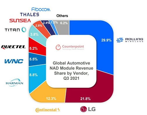 就营收而言,Rolling Wireless、LG和Continental是2021年第三季全球三大NAD模组供应商。这三个品牌占据市场总营收的三分之二。
