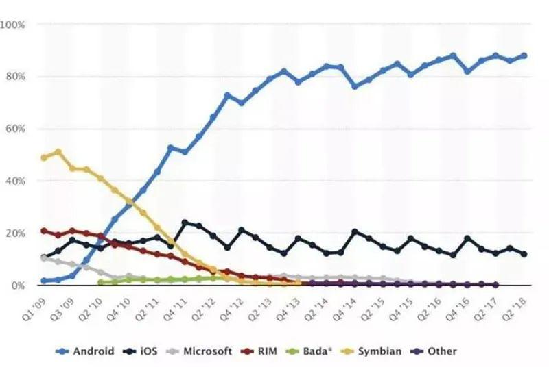 ▲2009-2018年智能手机操作系统市场占有率变化