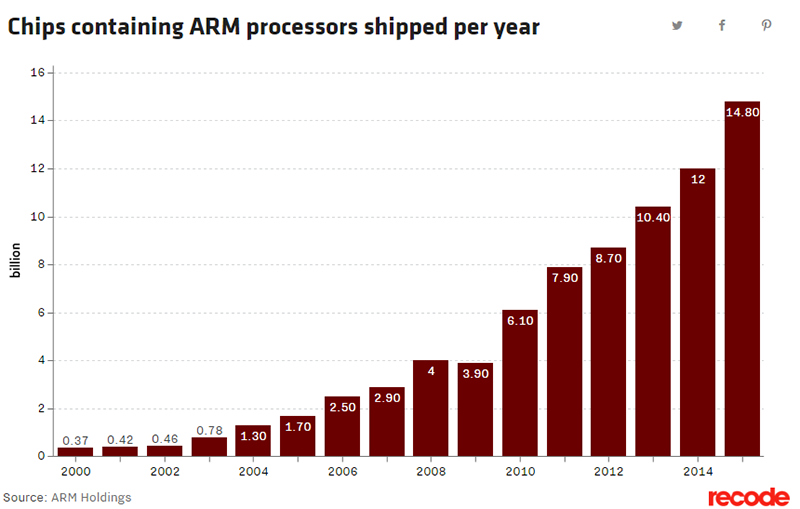 ▲2000-2014年Arm处理器出货量(图源:recode)