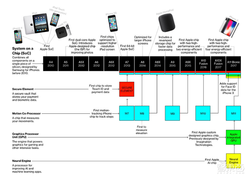 ▲2010-2017年苹果各终端设备搭载的自研芯片