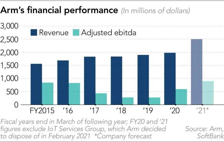 ▲2015年~2020年Arm收入及调整后息税前利润变化(图源:英国金融时报)