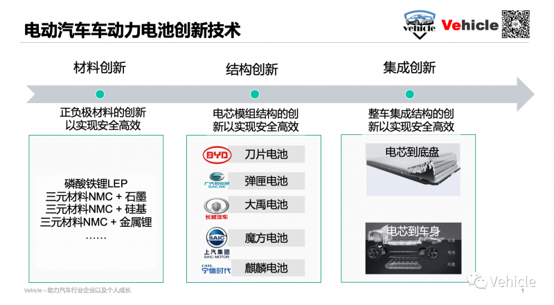 能源矿产经过提纯组合,封装等步骤再整合进入电动汽车,所以电动车动力电池技术分为材料创新、封装及结构创新、整车集成创新三部分。