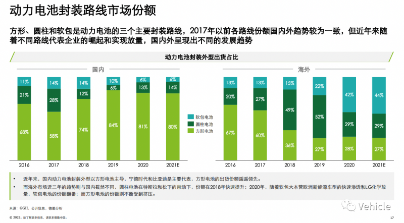方形电池,圆柱电池,软包电池他们各有优缺点。目前按照出货量来看的话国内80%以上都为以宁德时代、比亚迪为代表的方形电池。海外就比较特殊了,圆柱和软包占比超过70%。