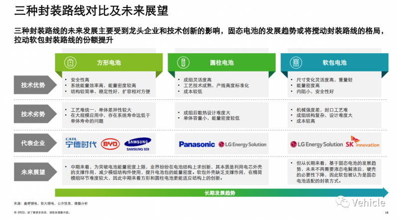 但根据分析,对于电池封装以及机构中期来看,为突破电池能量密度上限,业界纷纷在电池结构上求创新,其本质是利用电芯外壳的支撑作用,减少模组结构件使用,提升电池包的能量密度。软包外壳缺乏支撑作用,在精简模组环节难度较大,因此中期来看方形和圆柱电池更能适应结构上的创新。但从长期来看,基于固态电池的发展趋势,未来不再需要液态电解液后,硬壳的必要性下降,因此软包被认为是固态电池适配的封装方式。