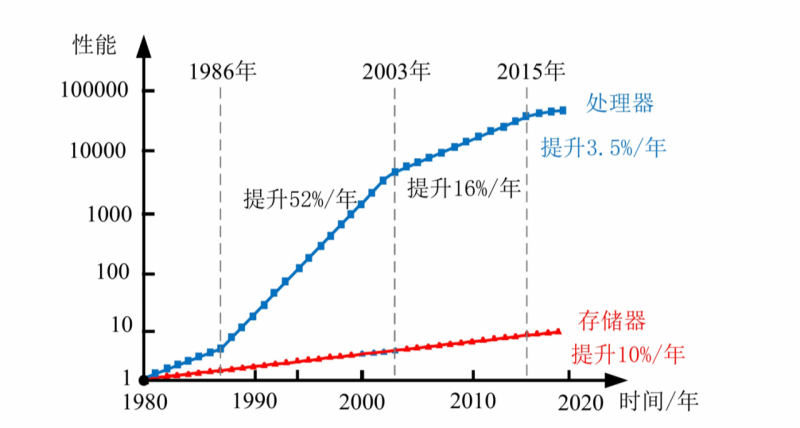 基于冯诺依曼架构的计算机在计算过程中,会将计算所需的包括输入数据、计算后的返回数据等信息带到一个被称为计算机内存的位置。程序在运行过程中需要计算机存储器及时地为计算提供指令和操作数。由于计算机的 CPU 和存储器是相互独立发展的,两者的发展速度并不一致。虽然近几年 CPU 的性能增长速度放缓,但存储系统的性能并没有跟上,计算机对内存的访问速度依旧比计算的速度慢得多。CPU 和内存系统之间的性能差距严重影响目标应用程序的功率和性能指标。半导体技术的不断提升,又将导致内存性能差距的继续扩大,致使在运行程序时,CPU 需要等待存储器提供数据,无法充分发挥 CPU 的性能。这种 CPU 处理数据的速度与存储器读写数据速度之间严重失衡的问题,被称为"内存墙"。另一方面,系统的计算能力不仅取决于它在一秒钟内可以执行的计算量,还取决于将数据转移到这些计算中的能力和效率。随着数据处理量呈指数级增长,在面对如卷积神经网络、人工智能等这些需要频繁读写操作的数据密集型应用时,数据在 CPU 和存储器间来回的传输导致了巨大的数据复制和通信成本,功耗巨大。此外,由于当前的存储体系将程序以数据的形式与其他数据共同存储在存储器中,为了在执行程序时不引起访问错误,需要从内存中提取指令并在处理单元中执行。随着计算的并行度在不断提高,和通信带宽的限制,导致数据传输速率受限,影响算力。内存、功耗、带宽等方面存在的种种问题不利于执行当前以数据为中心的应用,阻碍了高性能、节能计算系统的进一步发展。