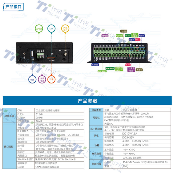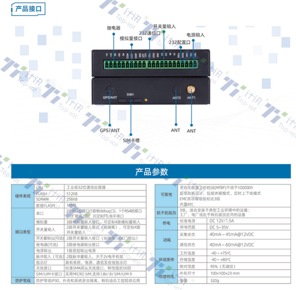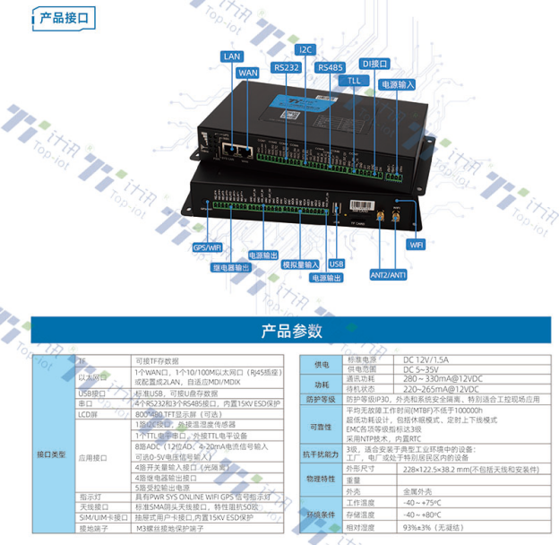 - 接口丰富,设备传感器仪器仪表等即插即用,配有网口、RS232接口、RS485接口、I2C接口、TTL电平串口、开关量、 模拟量、继电器输出、电源输出(外设供电)等,支持各类流量计、水位计、水质分析仪、雨量计、气象要素传感器、视频摄像头等仪器;