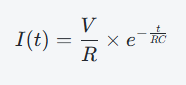 这个公式显示了电容充电电流随时间指数衰减的特点,充电初期电流较大,随后逐渐减小,并最终趋近于零。