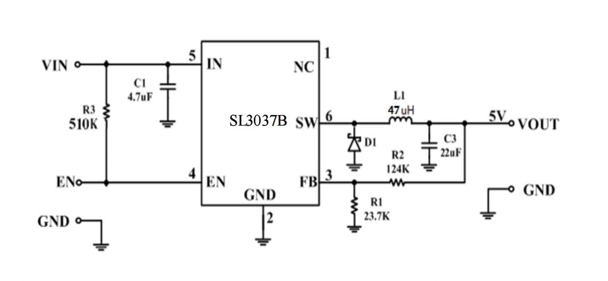 4. 外围器件少:由于其内置的MOS管设计,SL3037B在降压转换中仅需要极少的外围元器件,使得电路设计更为简洁。
