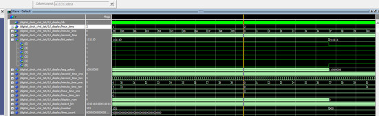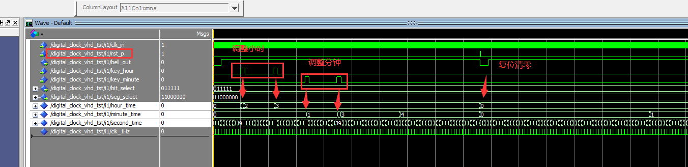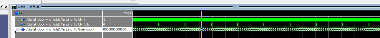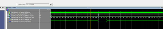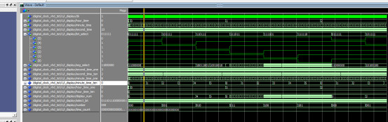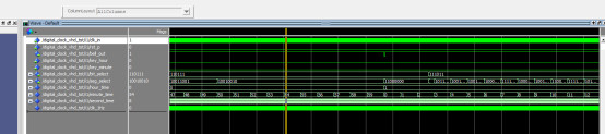 LIBRARY ieee; USE ieee.std_logic_1164.all; USE ieee.std_logic_unsigned.all; --数字钟 ENTITY Digital_clock IS PORT ( clk_in : IN STD_LOGIC;--50MHz rst_p : IN STD_LOGIC;--复位--reset bell_out : OUT STD_LOGIC;--整点报时 key_hour : IN STD_LOGIC;--修改小时--长按--Key0 key_minute : IN STD_LOGIC;--修改分钟--长按--Key1 bit_select : OUT STD_LOGIC_VECTOR(5 DOWNTO 0);--数码管位选 seg_select : OUT STD_LOGIC_VECTOR(7 DOWNTO 0)--数码管段选 ); END Digital_clock; ARCHITECTURE trans OF Digital_clock IS --模块声明 COMPONENT Bell IS PORT ( clk_in : IN STD_LOGIC; hour_time : IN STD_LOGIC_VECTOR(7 DOWNTO 0); minute_time : IN STD_LOGIC_VECTOR(7 DOWNTO 0); second_time : IN STD_LOGIC_VECTOR(7 DOWNTO 0); bell_out : OUT STD_LOGIC ); END COMPONENT; COMPONENT display IS PORT ( clk : IN STD_LOGIC; hour_time : IN STD_LOGIC_VECTOR(7 DOWNTO 0); minute_time : IN STD_LOGIC_VECTOR(7 DOWNTO 0); second_time : IN STD_LOGIC_VECTOR(7 DOWNTO 0); bit_select : OUT STD_LOGIC_VECTOR(5 DOWNTO 0);--数码管位选 seg_select : OUT STD_LOGIC_VECTOR(7 DOWNTO 0)--数码管段选 ); END COMPONENT; COMPONENT fenping IS PORT ( clk_in : IN STD_LOGIC; clk_1Hz : OUT STD_LOGIC ); END COMPONENT; COMPONENT jishi IS PORT ( clk_in : IN STD_LOGIC; rst_p : IN STD_LOGIC;--复位 key_hour : IN STD_LOGIC;--修改小时 key_minute : IN STD_LOGIC;--修改分钟 clk_1Hz : IN STD_LOGIC; hour_time : OUT STD_LOGIC_VECTOR(7 DOWNTO 0); minute_time : OUT STD_LOGIC_VECTOR(7 DOWNTO 0); second_time : OUT STD_LOGIC_VECTOR(7 DOWNTO 0) ); END COMPONENT; SIGNAL hour_time : STD_LOGIC_VECTOR(7 DOWNTO 0); SIGNAL minute_time : STD_LOGIC_VECTOR(7 DOWNTO 0); SIGNAL second_time : STD_LOGIC_VECTOR(7 DOWNTO 0); SIGNAL clk_1Hz : STD_LOGIC; BEGIN --分频到1Hz fenping_Hz : fenping PORT MAP ( clk_in => clk_in, clk_1Hz => clk_1Hz );