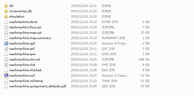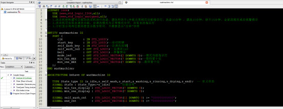 LIBRARY ieee; USE ieee.std_logic_1164.all; USE ieee.std_logic_unsigned.all; -- 1.洗衣机控制器可以驱动洗衣机进行洗涤、漂洗和供干;并能点亮相应功能指示灯,洗涤30分钟 ,漂洗10分钟,烘干15分钟,全部流程完成后报警提示 -- 2.洗衣机可实现自清洗功能,自清洗模式与正常模式分开,并有自洗指示灯 -- 3.计时显示用两位数码管显示数字即可,不需要显示“分钟”字样 ENTITY washmachine IS PORT ( clk : IN STD_LOGIC; start_key : IN STD_LOGIC;--启动按键 self_wash_key : IN STD_LOGIC;--自清洗按键 self_wash_led : OUT STD_LOGIC;--自清洗led bell : OUT STD_LOGIC;--报警提示 mode_led : OUT STD_LOGIC_VECTOR(2 DOWNTO 0);--模式功能指示灯 min_ten_HEX : OUT STD_LOGIC_VECTOR(7 DOWNTO 0);--数码管十位 min_one_HEX : OUT STD_LOGIC_VECTOR(7 DOWNTO 0)--数码管个位 ); END washmachine; ARCHITECTURE behave OF washmachine IS TYPE State_type IS (s_idle,s_self_wash,s_start,s_washing,s_rinsing,s_drying,s_end); -- 定义状态 SIGNAL State : State_Type:=s_idle; -- 创建信号 SIGNAL min_ten_display : STD_LOGIC_VECTOR(7 DOWNTO 0); SIGNAL min_one_display : STD_LOGIC_VECTOR(7 DOWNTO 0); SIGNAL self_wash_cnt : STD_LOGIC_VECTOR(11 DOWNTO 0) := "000000000000"; SIGNAL end_cnt : STD_LOGIC_VECTOR(11 DOWNTO 0) := "000000000000"; SIGNAL minute_ten : STD_LOGIC_VECTOR(3 DOWNTO 0) := "0101"; SIGNAL minute_one : STD_LOGIC_VECTOR(3 DOWNTO 0) := "0101"; SIGNAL second_cnt : STD_LOGIC_VECTOR(7 DOWNTO 0) := "00000000"; SIGNAL selfwash_led : STD_LOGIC := \'0\'; SIGNAL bell_buf : STD_LOGIC := \'0\'; SIGNAL mode_led_buf : STD_LOGIC_VECTOR(2 DOWNTO 0) := "000"; BEGIN min_ten_HEX <= min_ten_display; min_one_HEX <= min_one_display; --状态机控制 PROCESS (clk) BEGIN IF (clk\'EVENT AND clk = \'1\') THEN CASE state IS WHEN s_idle =>--空闲状态 IF (self_wash_key = \'1\') THEN--按下自清洗按键 state <= s_self_wash; ELSIF (start_key = \'1\') THEN--按下启动按键 state --自清洗 IF (self_wash_cnt >= "001001011000") THEN--自清洗时间10分钟 state <= s_idle; ELSE state --启动 state --洗涤 IF (minute_ten = "0010" AND minute_one = "0101" AND second_cnt = "00000000") THEN--流程一共55分钟,洗涤30分钟 state <= s_rinsing; ELSE state --漂洗 IF (minute_ten = "0001" AND minute_one = "0101" AND second_cnt = "00000000") THEN--漂洗10分钟 state <= s_drying; ELSE state --烘干 IF (minute_ten = "0000" AND minute_one = "0000" AND second_cnt = "00000000") THEN--烘干15分钟 state <= s_end; ELSE state --结束 IF (end_cnt >= "000000011110") THEN--报警时间30s state <= s_idle; ELSE state END CASE; END IF; END PROCESS;