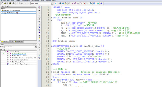 LIBRARY ieee; USE ieee.std_logic_1164.all; USE ieee.std_logic_unsigned.all; --交通定时控制 ENTITY traffic_time IS PORT ( clk :IN STD_LOGIC;--时钟端口 S :IN STD_LOGIC;--置数端 FQ :IN STD_LOGIC_VECTOR(3 DOWNTO 0);--输入端口个位 SQ :IN STD_LOGIC_VECTOR(3 DOWNTO 0);--输入端口十位 SLED : OUT STD_LOGIC_VECTOR(7 DOWNTO 0);--输出十位显示端口 FLED : OUT STD_LOGIC_VECTOR(7 DOWNTO 0)--端口个位 ); END traffic_time; ARCHITECTURE behave OF traffic_time IS --定义信号 SIGNAL SD:STD_LOGIC_VECTOR(3 downto 0); SIGNAL FD:STD_LOGIC_VECTOR(3 downto 0); SIGNAL ck1s: STD_LOGIC:='0';--1Hz SIGNAL iFD: STD_LOGIC_VECTOR(3 downto 0); SIGNAL iSD: STD_LOGIC_VECTOR(3 downto 0); BEGIN --分频到1Hz ck1sP:Process(clk) --Process to generate 1Hz clock Variable tmp: INTEGER RANGE 0 to 15999:=0; Begin If clk'EVENT AND clk='0' then If tmp=159 then --为便于仿真将15999改小为159 tmp:=0; ck1s<=NOT(ck1s); Else tmp:= tmp+1; END IF; END IF; End Process ck1sP; LGTP: Process(ck1s,S) --100S timer Begin IF S='1' then iSD<=SQ;--十位 iFD<=FQ;--个位 ELSIF ck1s'EVENT AND ck1s='0' then IF iFD="0000" then --when FD is decreased to 0(in Decimal) IF iSD="0000" then --when SD is decreased to 0 (in Decimal) iSD<="1001"; iFD<="1001"; ELSE iSD<=iSD-"0001"; iFD<="1001"; END IF; ELSE iFD<=iFD-"0001"; END IF; END IF; SD<=iSD; FD<=iFD; End Process LGTP; --数码管译码电路显示十位 SLED<= X"3F" WHEN SD="0000" ELSE--"0" X"06" WHEN SD="0001" ELSE--"1" X"5B" WHEN SD="0010" ELSE--"2" X"4F" WHEN SD="0011" ELSE--"3" X"66" WHEN SD="0100" ELSE--"4" X"6D" WHEN SD="0101" ELSE--"5" X"7D" WHEN SD="0110" ELSE--"6" X"07" WHEN SD="0111" ELSE--"7" X"7F" WHEN SD="1000" ELSE--"8" X"6F" WHEN SD="1001" ELSE--"9" X"00";--light off