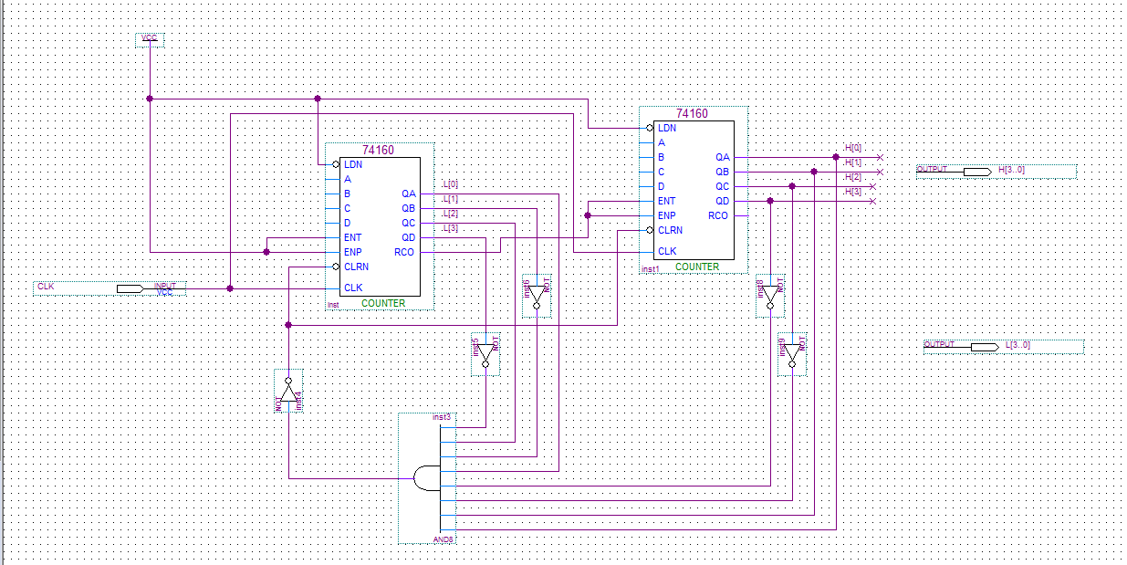 设计35进制计数器,即计数0~34,输出用2位8421BCD码显示。设计思路如下:在使用2片74160芯片设计,74160是10进制计数器,通过俩片74150组合可以设计为35进制。一片74160作为个位计数,一片作为十位计数,当个位计数到9时,十位加1,若个位为5且十位为3时表示计数到35.此时将系统复位清零,即重新开始0~34计数。