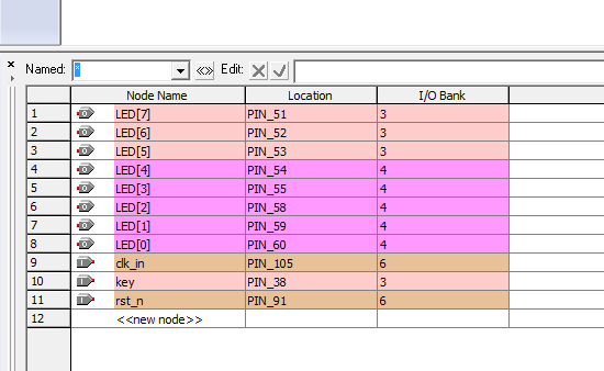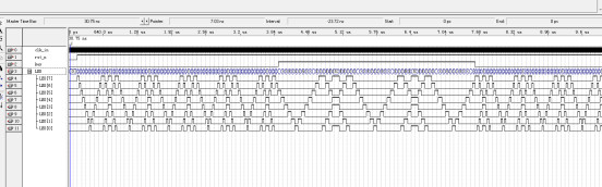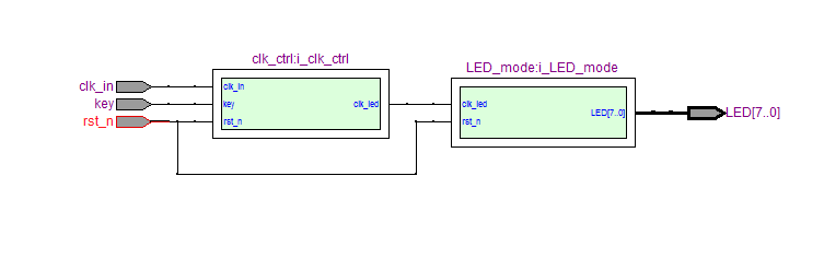 本次设计选择8路LED灯进行花样显示,设置4种花样显示模式分别为:从左到右逐个点亮LED;从右到左逐个点亮LED;从两边到中间逐个点亮LED;从中间到两边两个点亮LED。4种模式循环切换,复位键(rst)控制系统的运行停止。