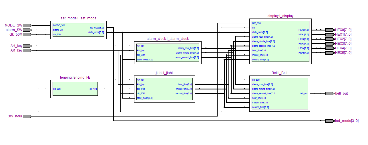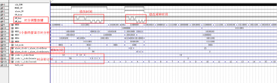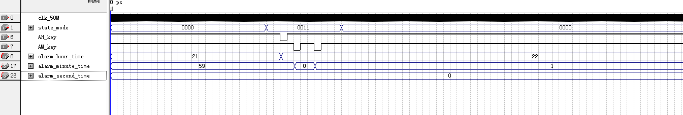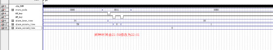 //设置闹钟模块 module alarm_clock( input clk_50M, input [3:0] state_mode,////当前模式,4'd0:计时,4'd1设置时间 ,4'd2显示闹钟时间,4'd3设置闹钟时间 input AH_key,//AH 修改小时 input AM_key,//AM 修改分钟 output [7:0] alarm_hour_time,//时 output [7:0] alarm_minute_time,//分 output [7:0] alarm_second_time//秒 ); wire AH_key_negedge; wire AM_key_negedge; reg AH_key_buf0; reg AH_key_buf1; reg AM_key_buf0; reg AM_key_buf1; always@(posedge clk_50M) begin AH_key_buf0<=AH_key; AH_key_buf1<=AH_key_buf0; end always@(posedge clk_50M) begin AM_key_buf0<=AM_key; AM_key_buf1<=AM_key_buf0; end assign AH_key_negedge=~AH_key_buf0 & AH_key_buf1;//按键下降沿 assign AM_key_negedge=~AM_key_buf0 & AM_key_buf1;//按键下降沿 reg [7:0] hour=8'd21;//时 reg [7:0] minute=8'd59;//分 reg [7:0] second=8'd00;//秒