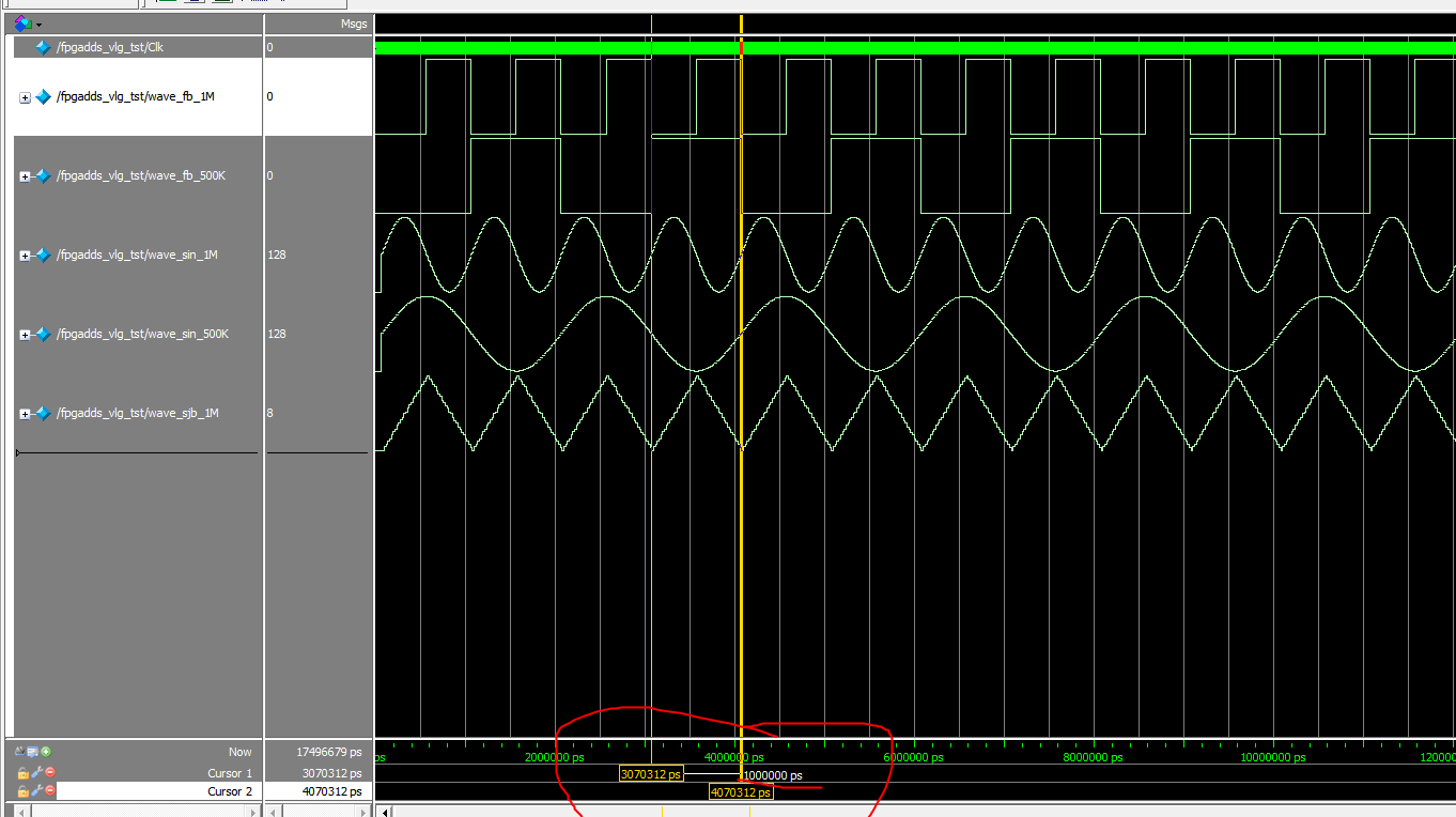 测得图中两条竖直黄线之间周期为1000000ps=1us,即频率为1MHz