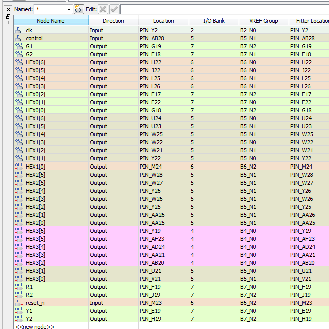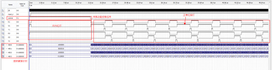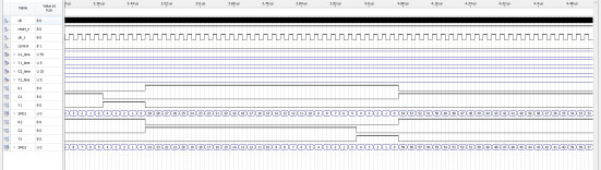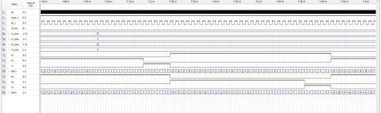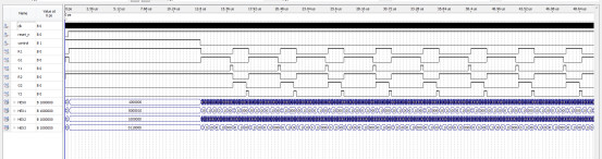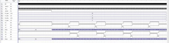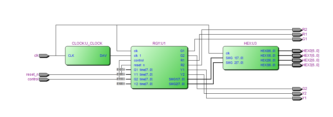 LIBRARY ieee; USE ieee.std_logic_1164.all; --交通灯 ENTITY Traffic_Light_Control IS PORT ( clk : IN STD_LOGIC;--50Mhz reset_n : IN STD_LOGIC;--复位 control : IN STD_LOGIC;--特殊功能 R1 : OUT STD_LOGIC;--高电平亮,主路红灯 G1 : OUT STD_LOGIC;--高电平亮,主路绿灯 Y1 : OUT STD_LOGIC;--高电平亮,主路黄灯 R2 : OUT STD_LOGIC;--高电平亮,支路红灯 G2 : OUT STD_LOGIC;--高电平亮,支路绿灯 Y2 : OUT STD_LOGIC;--高电平亮,支路黄灯 HEX0 : OUT STD_LOGIC_VECTOR(6 DOWNTO 0);--数码管0 HEX1 : OUT STD_LOGIC_VECTOR(6 DOWNTO 0);--数码管1 HEX2 : OUT STD_LOGIC_VECTOR(6 DOWNTO 0);--数码管2 HEX3 : OUT STD_LOGIC_VECTOR(6 DOWNTO 0)--数码管3 ); END Traffic_Light_Control; ARCHITECTURE behave OF Traffic_Light_Control IS --分频模块 COMPONENT CLOCK IS-- Divide 50MHz to 1Hz GENERIC(D : INTEGER := 50000000);--仿真时改小为500加快仿真速度,实际上板验证时改为50000000 PORT(CLK: IN STD_LOGIC; DAV: OUT STD_LOGIC); END COMPONENT; --显示模块 COMPONENT HEX IS PORT ( clk : IN STD_LOGIC; SMG_1 : IN STD_LOGIC_VECTOR(7 DOWNTO 0); SMG_2 : IN STD_LOGIC_VECTOR(7 DOWNTO 0); HEX0 : OUT STD_LOGIC_VECTOR(6 DOWNTO 0); HEX1 : OUT STD_LOGIC_VECTOR(6 DOWNTO 0); HEX2 : OUT STD_LOGIC_VECTOR(6 DOWNTO 0); HEX3 : OUT STD_LOGIC_VECTOR(6 DOWNTO 0) ); END COMPONENT; --交通灯控制模块 COMPONENT RGY IS PORT ( clk_1 : IN STD_LOGIC; clk : IN STD_LOGIC; reset_n : IN STD_LOGIC;--复位 control : IN STD_LOGIC;----特殊功能 G1_time : IN STD_LOGIC_VECTOR(7 DOWNTO 0); Y1_time : IN STD_LOGIC_VECTOR(7 DOWNTO 0); G2_time : IN STD_LOGIC_VECTOR(7 DOWNTO 0); Y2_time : IN STD_LOGIC_VECTOR(7 DOWNTO 0); R1 : OUT STD_LOGIC; G1 : OUT STD_LOGIC; Y1 : OUT STD_LOGIC; R2 : OUT STD_LOGIC; G2 : OUT STD_LOGIC; Y2 : OUT STD_LOGIC; SMG1 : OUT STD_LOGIC_VECTOR(7 DOWNTO 0);--输出数码管显示数 SMG2 : OUT STD_LOGIC_VECTOR(7 DOWNTO 0)--输出数码管显示数 ); END COMPONENT; SIGNAL clk_1 : STD_LOGIC; SIGNAL SMG1 : STD_LOGIC_VECTOR(7 DOWNTO 0); SIGNAL SMG2 : STD_LOGIC_VECTOR(7 DOWNTO 0); SIGNAL R1_led : STD_LOGIC; SIGNAL G1_led : STD_LOGIC; SIGNAL Y1_led : STD_LOGIC; SIGNAL R2_led : STD_LOGIC; SIGNAL G2_led : STD_LOGIC; SIGNAL Y2_led : STD_LOGIC; SIGNAL G1_time : STD_LOGIC_VECTOR(7 DOWNTO 0); SIGNAL Y1_time : STD_LOGIC_VECTOR(7 DOWNTO 0); SIGNAL G2_time : STD_LOGIC_VECTOR(7 DOWNTO 0); SIGNAL Y2_time : STD_LOGIC_VECTOR(7 DOWNTO 0); SIGNAL HEX0_SIG : STD_LOGIC_VECTOR(6 DOWNTO 0); SIGNAL HEX1_SIG : STD_LOGIC_VECTOR(6 DOWNTO 0); SIGNAL HEX2_SIG : STD_LOGIC_VECTOR(6 DOWNTO 0); SIGNAL HEX3_SIG : STD_LOGIC_VECTOR(6 DOWNTO 0); BEGIN HEX0 <= HEX0_SIG; HEX1 <= HEX1_SIG; HEX2 <= HEX2_SIG; HEX3 <= HEX3_SIG; R1 <= R1_led;--主路红灯 G1 <= G1_led;--主路绿灯 Y1 <= Y1_led;--主路黄灯 R2 <= R2_led;--支路红灯 G2 <= G2_led;--支路绿灯 Y2 <= Y2_led;--支路黄灯