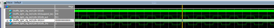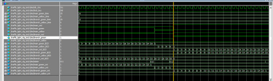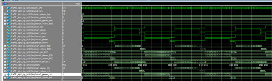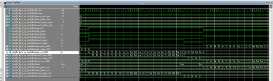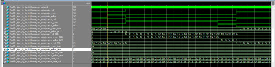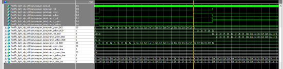/* 红->绿 绿->黄 黄->红 1、红--计时main_red_times------------------------绿--计时main_green_times---main_yellow_times黄灯---------------红 2、绿--计时branch_green_times---branch_yellow_times黄灯--------------------红--计时branch_reg_times-------------------绿 */ module traffic_light( input clk,//50Mhz input lock_key,//紧急按键--按下均为红灯,为1紧急状态,为0正常状态 input suspend_key,//暂停按键,高电平时暂停 output main_red,//主路灯 output main_green,//主路灯 output main_yellow,//主路灯 output branch_red,//支路灯 output branch_green,//支路灯 output branch_yellow,//支路灯 output [7:0] HEX0,//(主干道)数码管0 output [7:0] HEX1,//(主干道)数码管1 output [7:0] HEX2,//(支干道)数码管2 output [7:0] HEX3//(支干道)数码管3 ); wire clk_1Hz; wire [7:0] main_green_BCD; wire [7:0] main_yellow_BCD; wire [7:0] main_red_BCD; wire [7:0] branch_green_BCD; wire [7:0] branch_yellow_BCD; wire [7:0] branch_red_BCD; wire [7:0] main_data_out; wire [7:0] branch_data_out; wire main_red_led;//主路灯 wire main_green_led;//主路灯 wire main_yellow_led;//主路灯 wire branch_red_led;//支路灯 wire branch_green_led;//支路灯 wire branch_yellow_led;//支路灯 assign main_red=main_red_led;//主路灯 assign main_green=main_green_led;//主路灯 assign main_yellow=main_yellow_led ;//主路灯 assign branch_red=branch_red_led;//支路灯 assign branch_green=branch_green_led;//支路灯 assign branch_yellow=branch_yellow_led ;//支路灯 //分频模块 div div100 ( . clk(clk), . suspend_key(suspend_key), . clk_out(clk_1Hz) ); //两边周期一样,红灯时间30秒,绿灯时间25秒,黄灯时间5秒 //按键调整时间 wire [7:0]main_green_time;//由外部控制 wire [7:0]main_yellow_time; wire [7:0]branch_green_time;//由外部控制 wire [7:0]branch_yellow_time; assign main_yellow_time=8'd5;//主路黄灯时间设置为5秒 assign branch_yellow_time=8'd5;//支路黄灯时间设置为5秒 assign main_green_time=8'd25;//默认绿灯25秒 assign branch_green_time=8'd25;//默认绿灯25秒 /////////////////////////////// reg [7:0] display_main; reg [7:0] display_branch;