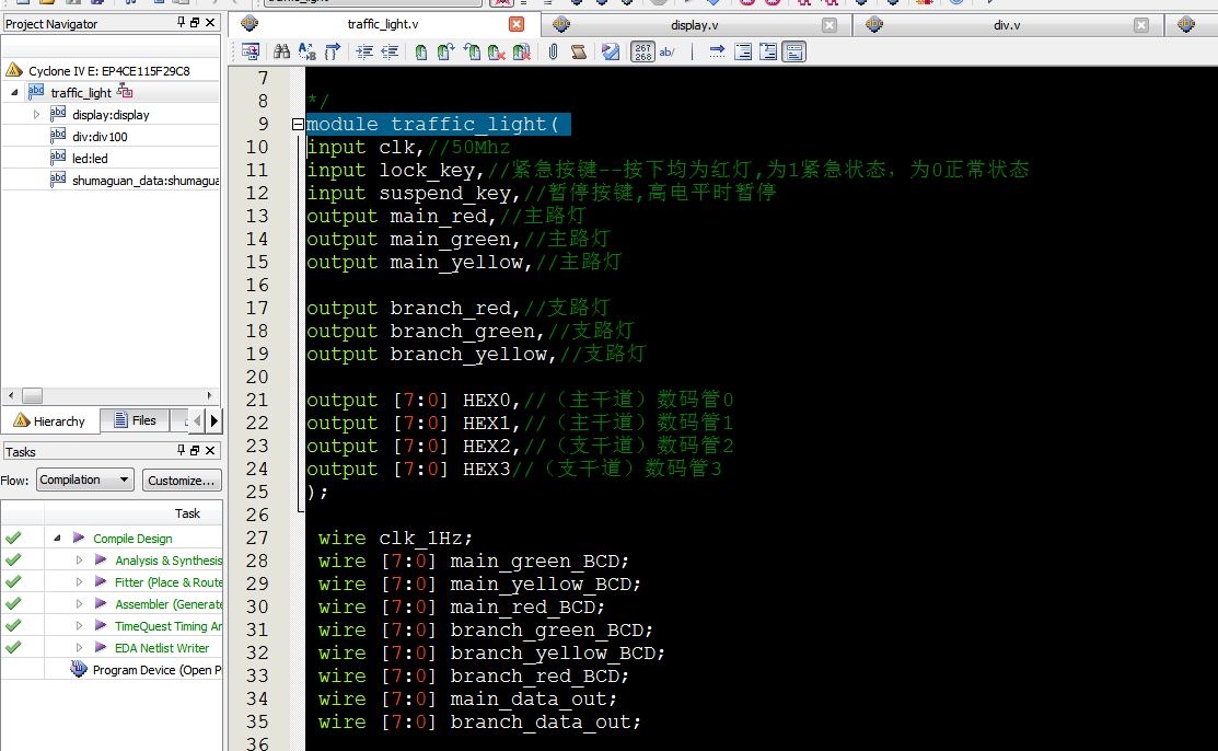 名称:带紧急按键的交通灯设计Verilog代码Quartus DE2-115开发板