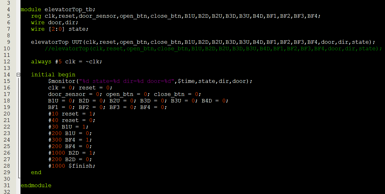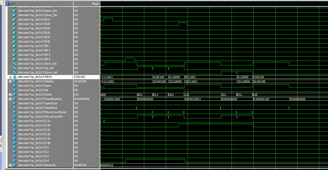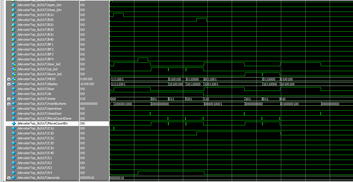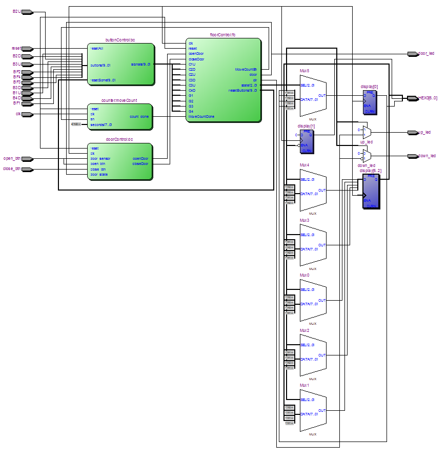 `timescale 1ns / 1ps module elevatorTop(clk,reset,open_btn,close_btn,B1U,B2D,B2U,B3D,B3U,B4D,BF1,BF2,BF3,BF4,door_led,up_led,down_led,HEX0); input clk,reset,open_btn,close_btn,B1U,B2D,B2U,B3D,B3U,B4D,BF1,BF2,BF3,BF4; output door_led; output up_led; output down_led; output [6:0]HEX0; reg [7:0]display; wire door, dir; wire [2:0] state; wire [9:0] resetButtons; wire openDoor, closeDoor, MoveCountDone, MoveCountEn; wire C1U,C2D,C2U,C3D,C3U,C4D,G1,G2,G3,G4; wire [7:0] seconds; assign seconds = 2; assign door_led=door; assign up_led=(state[0]==1)? dir:0;//运行时候才亮 assign down_led=(state[0]==1)? ~dir:0;//运行时候才亮 floorControl fc(clk,reset,openDoor,closeDoor,C1U,C2D,C2U,C3D,C3U,C4D,G1,G2,G3,G4,MoveCountDone,MoveCountEn,door,dir,state,resetButtons); buttonControl bc({B1U,B2D,B2U,B3D,B3U,B4D,BF1,BF2,BF3,BF4},reset,resetButtons,{C1U,C2D,C2U,C3D,C3U,C4D,G1,G2,G3,G4}); doorControl dc(reset,clk,open_btn,open_btn,close_btn,door,openDoor,closeDoor); counter moveCount