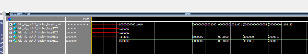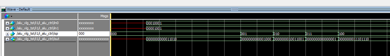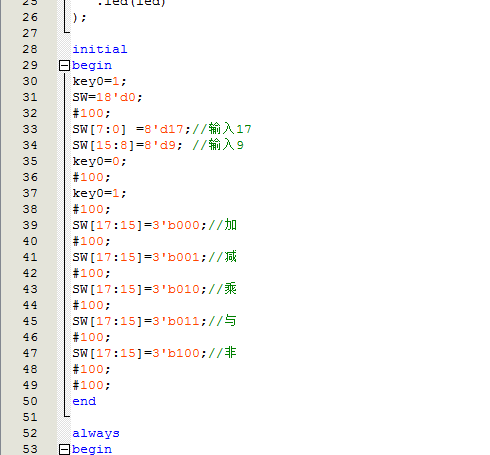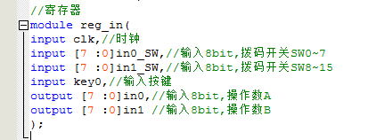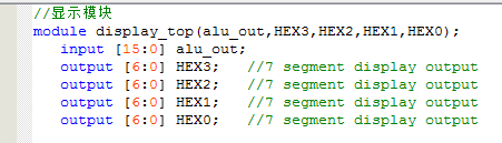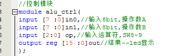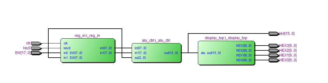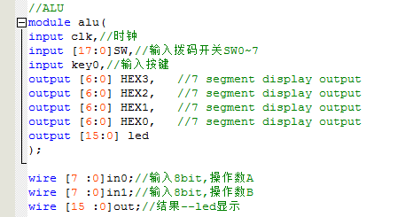 `timescale 10ns/1ns //ALU module alu( input clk,//时钟 input [17:0]SW,//输入拨码开关SW0~7 input key0,//输入按键 output [6:0] HEX3,//7 segment display output output [6:0] HEX2,//7 segment display output output [6:0] HEX1,//7 segment display output output [6:0] HEX0,//7 segment display output output [15:0] led ); wire [7 :0]in0;//输入8bit,操作数A wire [7 :0]in1;//输入8bit,操作数B wire [15 :0]out;//结果--led显示 assign led=out; //寄存器 reg_in i_reg_in( .clk(clk),//时钟 .in0_SW(SW[7:0]),//输入8bit,拨码开关SW0~7 .in1_SW(SW[15:8]),//输入8bit,拨码开关SW8~15 .key0(key0),//输入按键 .in0(in0),//输入8bit,操作数A .in1(in1)//输入8bit,操作数B ); //控制模块 alu_ctrl i_alu_ctrl( .in0(in0),//输入8bit,操作数A .in1(in1),//输入8bit,操作数B .op(SW[17:15]),//输入运算符,SW .out(out)//结果--led显示 );