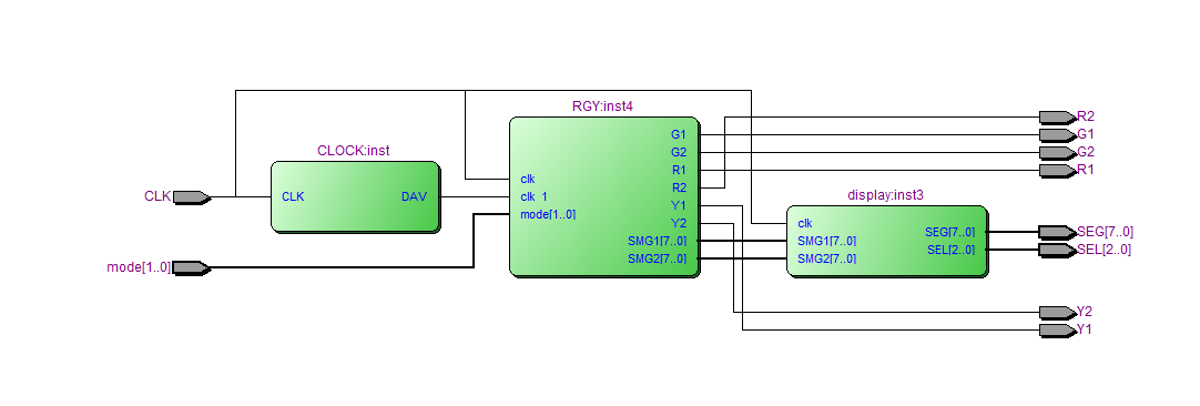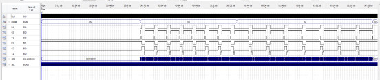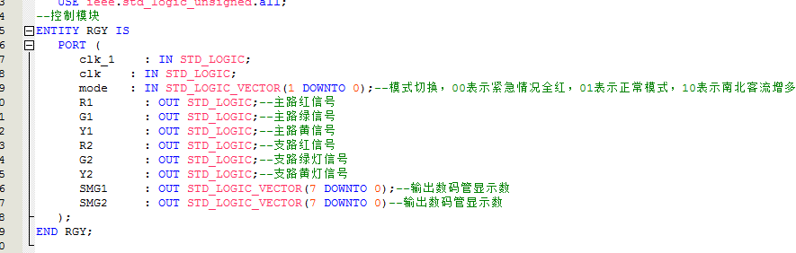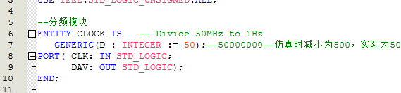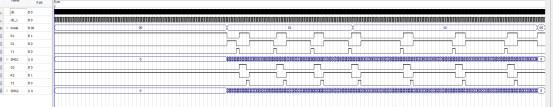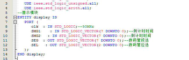 LIBRARY ieee; USE ieee.std_logic_1164.all; USE ieee.std_logic_unsigned.all; USE ieee.std_logic_arith.all; --显示模块 ENTITY display IS PORT ( clk : IN STD_LOGIC;--50MHz SMG1 : IN STD_LOGIC_VECTOR(7 DOWNTO 0);--倒计时时间 SMG2 : IN STD_LOGIC_VECTOR(7 DOWNTO 0);--倒计时时间 SEG : OUT STD_LOGIC_VECTOR(7 DOWNTO 0);--数码管段选 SEL : OUT STD_LOGIC_VECTOR(2 DOWNTO 0)--数码管位选 ); END display; ARCHITECTURE behavioral OF display IS SIGNAL SMG1_ten : INTEGER := 0; SIGNAL SMG1_one : INTEGER := 0; SIGNAL SMG2_ten : INTEGER := 0; SIGNAL SMG2_one : INTEGER := 0; SIGNAL SMG1_int : INTEGER := 0; SIGNAL SMG2_int : INTEGER := 0; SIGNAL display_data : INTEGER := 0; SIGNAL select_num : STD_LOGIC_VECTOR(31 DOWNTO 0) := "00000000000000000000000000000000"; SIGNAL geshu : STD_LOGIC_VECTOR(15 DOWNTO 0) := "0000000000000000"; BEGIN SMG1_int<=Conv_Integer(SMG1);--转为int类型 SMG2_int<=Conv_Integer(SMG2);--转为int类型 SMG1_ten <= SMG1_int / 10;--时间十位 SMG1_one <= SMG1_int- SMG1_ten *10;--时间个位 SMG2_ten <= SMG2_int / 10;--时间十位 SMG2_one <= SMG2_int- SMG2_ten *10;--时间个位