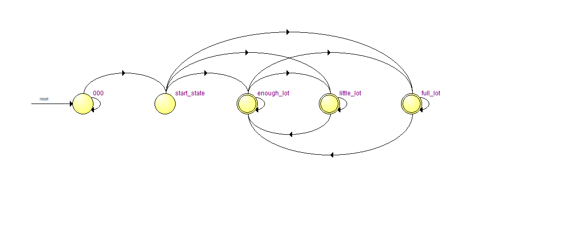 module car_part( input clk, input start,//开始,高电平有效 input [7:0]D,//预置车位数,可预置100个车位 input in_car,//有车进入脉冲 input out_car,//有车离开脉冲 output [7:0]left_parking_lot,//剩余车位 output [1:0] parking_state,//输出状态 output short_of_lot//车位少于5指示 ); parameter idle=3'd0; parameter start_state=3'd1; parameter full_lot=3'd2;//车位全可用=100 parameter enough_lot=3'd3;//车位足够5~99 parameter little_lot=3'd4;//车位不足1~4 parameter no_lot=3'd4;//无车位0 reg [2:0] state=3'd0; reg [7:0] lot_num=8'd0;//寄存器,存储车位数 reg in_car_0=0; reg in_car_1=0; wire in_car_rise; always@(posedge clk) begin in_car_0<=in_car; in_car_1<=in_car_0; end assign in_car_rise=in_car_0 & ~in_car_1;//检测in_car型号的上升沿 reg out_car_0=0; reg out_car_1=0; wire out_car_rise; always@(posedge clk) begin out_car_0<=out_car; out_car_1<=out_car_0; end