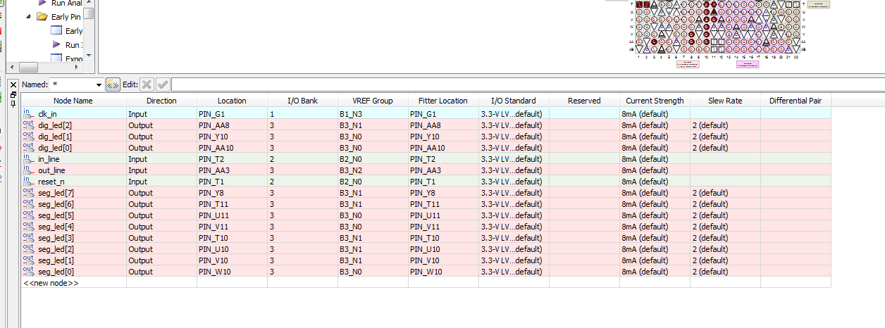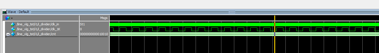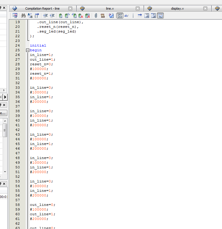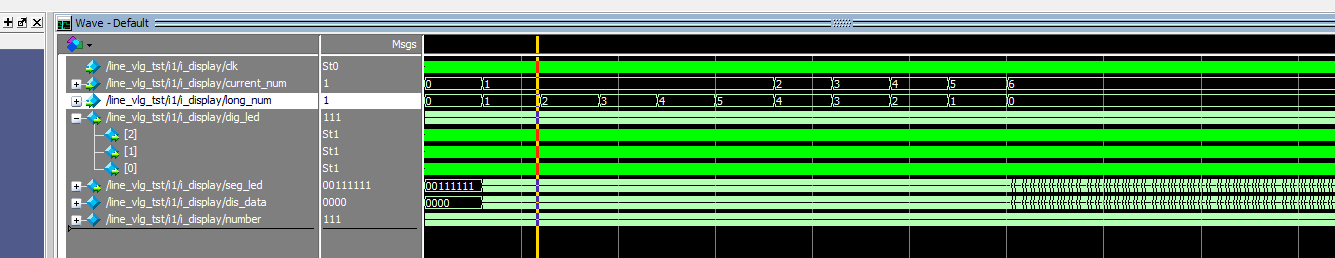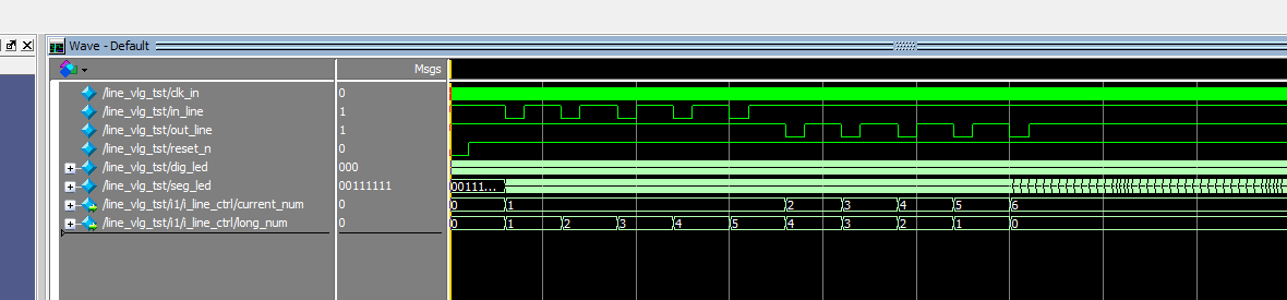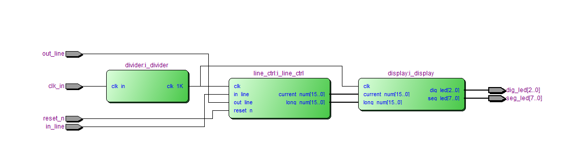 //排队设计 module line( input clk_in,//50MHz input reset_n,//复位 input in_line,//进队 input out_line,//出队 output [2:0] dig_led,//数码管位选 output [7:0] seg_led//数码管段选 ); wire clk_1K; //50MHz分频到1KHz divider i_divider( . clk_in(clk_in),//50MHz . clk_1K(clk_1K)//分频得到1Khz ); wire [15:0] current_num;//当前号码 wire [15:0] long_num;//队长 //排队控制模块 line_ctrl i_line_ctrl( . clk(clk_1K),//1KHz . reset_n(reset_n),//复位 . in_line(in_line),//进队 . out_line(out_line),//出队 . current_num(current_num),//当前号码 . long_num(long_num)//队长 ); //显示模块 display i_display( . clk(clk_1K), . current_num(current_num),//当前号码 . long_num(long_num),//队长 . dig_led(dig_led),//数码管位选 . seg_led(seg_led)//数码管段选 ); endmodule