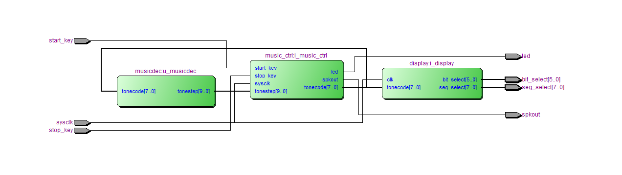 //音乐播放器 module music(sysclk,stop_key,start_key,led, spkout,bit_select,seg_select); input sysclk;//50M晶振 input stop_key;//reset input start_key;//开始 output spkout;//蜂鸣器输出 output led;//指示灯 output [5:0] bit_select;//数码管位选 output [7:0] seg_select;//数码管段选 wire [9:0] tonestep; wire [7:0] tonecode; wire [3:0] music_num; //调用频率控制字产生模块 musicdec u_musicdec ( .tonecode(tonecode),//输入简谱 .tonestep(tonestep)//输出频率控制字 ); //音乐控制模块 music_ctrl i_music_ctrl( .sysclk(sysclk), .start_key(start_key), .stop_key(stop_key), .tonecode(tonecode),//简谱 .tonestep(tonestep),//频率控制字 .spkout(spkout), .led(led) ); //数码管显示模块 display i_display( . clk(sysclk), . tonecode(tonecode), . bit_select(bit_select),//数码管位选 . seg_select(seg_select)//数码管段选 ); endmodule