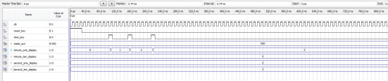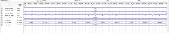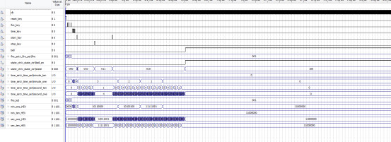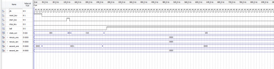 模块功能说明:输入为时间设置按键和当然状态,输出为BCD码时间,当在000状态时,通过按键可以设置分钟时间,当在010状态时,系统按一秒一次倒计时。倒计时为0后保持不变。当在011状态时,暂停倒计时。