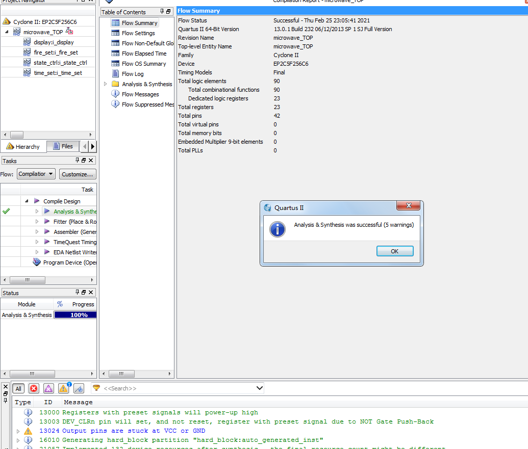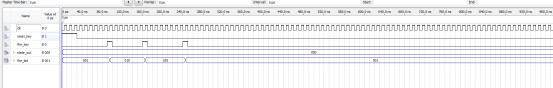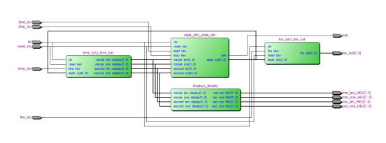 模块功能说明:输入包括启动和暂停键,以及当前时间,输出为状态值和报警信号,状态值一共有5种,分别为000表示设置状态,可以设置时间和火力。001表示启动,010表示启动后开始倒计时,011表示暂停,100表示倒计时结束,此时报警提示信号拉高。