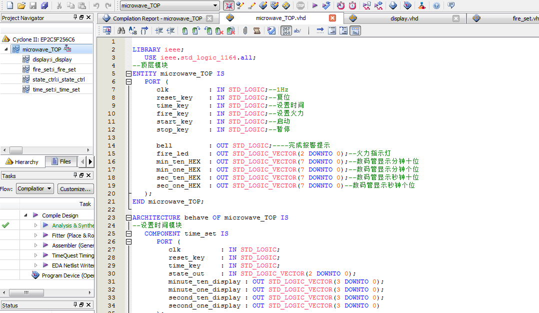 微波炉控制器是一件常见的设备,它能够根据不同的要求完成相应的功能。本设计以VHDL语言为主要表达方式,采用自上而下的设计方法,使用Quartus II 或 ISE 软件进行该微波炉控制器的设计。