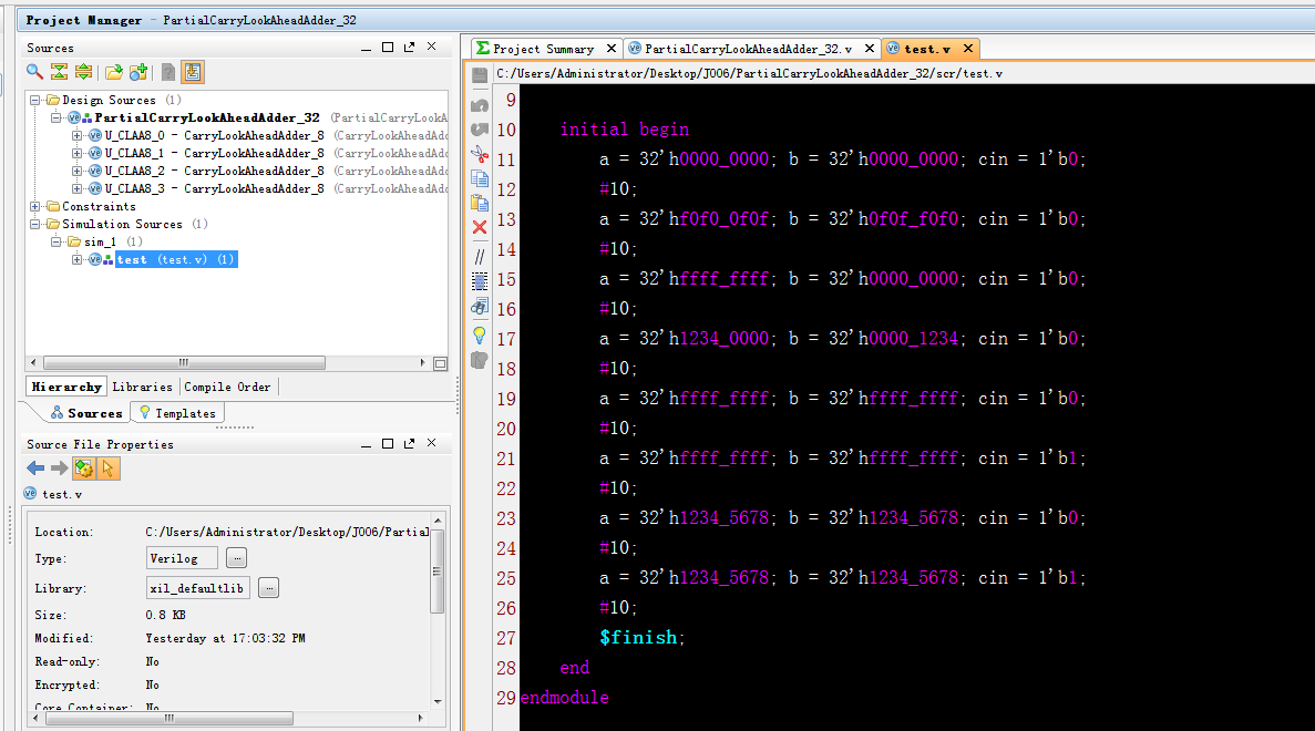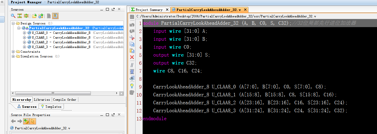名称:32位单级先行进位加法器设计Verilog代码VIVADO仿真