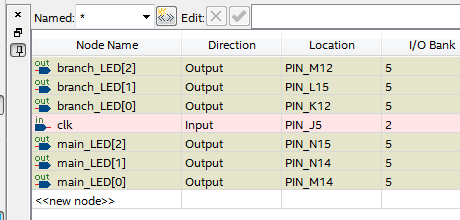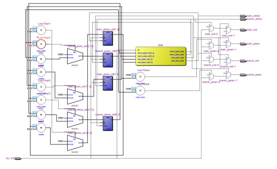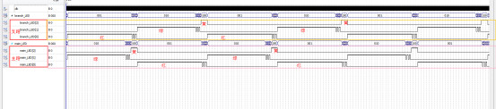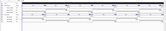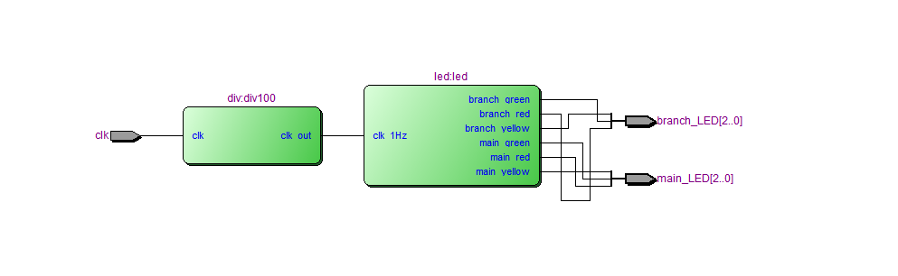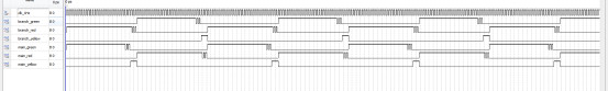 /* 红->绿 绿->黄 黄->红 1、红--计时main_red_times------------------------绿--计时main_green_times---main_yellow_times黄灯---------------红 2、绿--计时branch_green_times---branch_yellow_times黄灯--------------------红--计时branch_reg_times-------------------绿 */ //设路口A为主路,路口B为支路 module traffic_light( input clk,//时钟 //led 1亮0灭 output [2:0]main_LED,//主路灯 output [2:0]branch_LED//支路灯 ); wire clk_1Hz; wire main_red_led;//主路灯 wire main_green_led;//主路灯 wire main_yellow_led;//主路灯 wire branch_red_led;//支路灯 wire branch_green_led;//支路灯 wire branch_yellow_led;//支路灯 //led 1亮0灭 assign main_LED[0]=~main_red_led;//主路灯 assign main_LED[1]=~main_green_led;//主路灯 assign main_LED[2]=~main_yellow_led ;//主路灯 assign branch_LED[0]=~branch_red_led;//支路灯 assign branch_LED[1]=~branch_green_led;//支路灯 assign branch_LED[2]=~branch_yellow_led ;//支路灯 //分频模块 div div100 ( . clk(clk), . clk_out(clk_1Hz) );