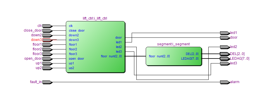 //3层电梯 //(1)控制电梯完成至少3层楼的载客服务,并遵循优先原则; //(3)能响应提前关门延时关门; //(4)具有超载报警和故障报警功能; //(5)显示电梯运行情况和电梯内外请求信息。 module lift( clk, fault_in,//超载和故障信号 alarm,//超载报警和故障报警输出 close_door, //提前关门 open_door , //延时关门 up1,//梯外按键,低电平有效 up2,//梯外按键,低电平有效 down2,//梯外按键,低电平有效 down3,//梯外按键,低电平有效 floor1,//梯内按键,低电平有效 floor2,//梯内按键,低电平有效 floor3,//梯内按键,低电平有效 led1,//梯内目的楼层,高电平有效 led2,//梯内目的楼层,高电平有效 led3,//梯内目的楼层,高电平有效 door,//开门 DEL, LEDAG ); input wireclk; input wire fault_in; input wireup1; input wireup2; input wiredown2; input wiredown3; input wirefloor1; input wirefloor2; input wirefloor3; output wire alarm; output wireled1; output wireled2; output wireled3; output wiredoor; output wire[2:0] DEL; output wire[7:0] LEDAG; input wireclose_door; //提前关门 input wireopen_door ; //延时关门