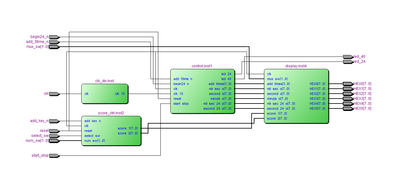 module basketball( input clk,//时钟 input reset,//复位 input start_n,//开始 input stop_n,//暂停 input ball_sw1,// input ball_sw2,// output stop_led, output over24sec_led, output [1:0]ball_led, output end_led, output [3:0] match, output [6:0] HEX0, output [6:0] HEX1, output [6:0] HEX2, output [6:0] HEX3, output [6:0] HEX4, output [6:0] HEX5 ); wire clk_10; wire [7:0] timedown_o; wire [7:0] time12_min_o; wire [7:0] time12_sec_o; clk_div i_clk_div( . clk(clk), . clk_10(clk_10) ); control i_control( . clk(clk), . clk_10(clk_10), . reset(reset), . start_n(start_n), . stop_n(stop_n), . ball_sw1(ball_sw1), . ball_sw2(ball_sw2), . stop_led(stop_led), . over24sec_led(over24sec_led), . ball_led(ball_led), . end_led(end_led), . match(match), . timedown_o(timedown_o), . time12_min_o(time12_min_o), . time12_sec_o(time12_sec_o) ); HEX i_HEX( .clk(clk), .timedown_o(timedown_o), .time12_min_o(time12_min_o), .time12_sec_o(time12_sec_o), .HEX0(HEX0), .HEX1(HEX1), .HEX2(HEX2), .HEX3(HEX3), .HEX4(HEX4), .HEX5(HEX5) ); endmodule