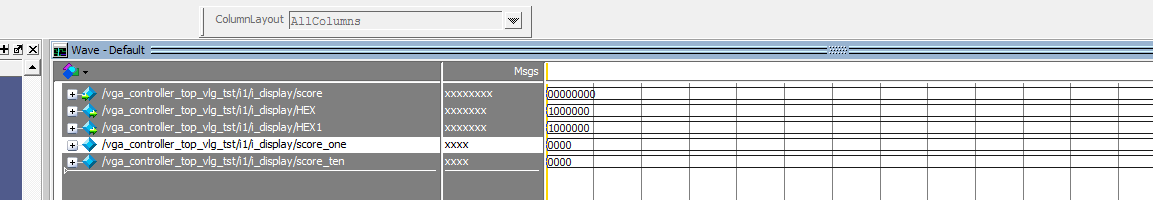 //数码管显示模块 module display(score, HEX,HEX1); input [7:0] score;//分数 output [6:0] HEX;//数码管 output [6:0] HEX1;//数码管信号 reg [6:0] HEX; reg [6:0] HEX1; wire [3:0] score_one; wire [3:0] score_ten; assign score_one=score%10; assign score_ten=score/10; always @(score_one) case (score_one) 4'b0000 : HEX <= 7'b1000000;//0 4'b0001 : HEX <= 7'b1111001;//1 4'b0010 : HEX <= 7'b0100100;//2 4'b0011 : HEX <= 7'b0110000;//3 4'b0100 : HEX <= 7'b0011001;//4 4'b0101 : HEX <= 7'b0010010;//5 4'b0110 : HEX <= 7'b0000010;//6 4'b0111 : HEX <= 7'b1111000;//7 4'b1000 : HEX <= 7'b0000000;//8 4'b1001 : HEX <= 7'b0010000;//9 default : ; endcase always @(score_ten) case (score_ten) 4'b0000 : HEX1 <= 7'b1000000;//0 4'b0001 : HEX1 <= 7'b1111001;//1