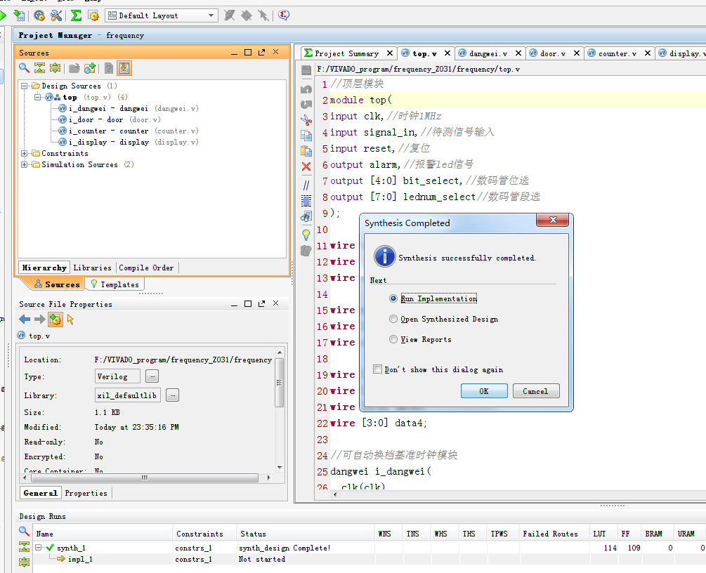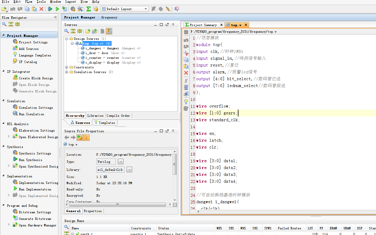 名称:基于FPGA的量程自动转换数字式频率计的设计Verilog代码VIVADO仿真