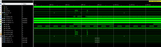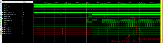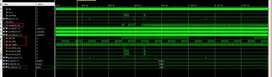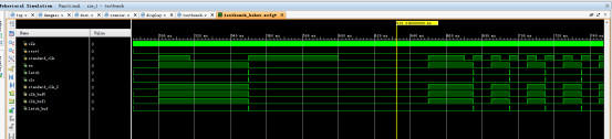 //4位10进制计数模块 //4位10进制计数模块在使能信号和清零信号的控制下对被测信号的波形变化进行计数,若产生溢出则为自动换档模块输出一换档信号 module counter( input signal_in,//待测信号 input en, input latch, input clr, output reg overflow,//输出一换档信号 output reg [3:0] data1,//4位计数值1 output reg [3:0] data2,//4位计数值2 output reg [3:0] data3,//4位计数值3 output reg [3:0] data4//4位计数值4 ); reg [3:0] cnt_1=4'd0; reg [3:0] cnt_2=4'd0; reg [3:0] cnt_3=4'd0; reg [3:0] cnt_4=4'd0; always@(*) if(clr) overflow=0;//清零 else if(en) if(cnt_4==4'd9 && cnt_3==4'd9 && cnt_2==4'd9 && cnt_1==4'd9)//计数到9999,溢出 overflow=1;//若产生溢出则为自动换档模块输出一换档信号 else overflow=overflow; else overflow=0; always@(posedge signal_in or posedge clr) if(clr) begin//计数清零 cnt_1<=4'd0; cnt_2<=4'd0; cnt_3<=4'd0; cnt_4<=4'd0; end else if(en) if(cnt_4==4'd9 && cnt_3==4'd9 && cnt_2==4'd9 && cnt_1==4'd9)//计数到9999 begin cnt_1<=4'd0; cnt_2<=4'd0; cnt_3<=4'd0; cnt_4<=4'd0; end else if(cnt_3==4'd9 && cnt_2==4'd9 && cnt_1==4'd9)//计数到999 begin cnt_1<=4'd0; cnt_2<=4'd0; cnt_3<=4'd0; cnt_4<=cnt_4+4'd1;//千位加1 end else if(cnt_2==4'd9 && cnt_1==4'd9)//计数到99 begin cnt_1<=4'd0; cnt_2<=4'd0; cnt_3<=cnt_3+4'd1;//百位加1 cnt_4<=cnt_4; end else if(cnt_1==4'd9)//计数到9 begin cnt_1<=4'd0; cnt_2<=cnt_2+4'd1;//十位加1 cnt_3<=cnt_3; cnt_4<=cnt_4; end else begin cnt_1<=cnt_1+4'd1;//个位加1 cnt_2<=cnt_2; cnt_3<=cnt_3; cnt_4<=cnt_4; end always@(latch) if(latch)//锁存信号 begin//将计数器锁存 data1<=cnt_1; data2<=cnt_2; data3<=cnt_3; data4<=cnt_4; end endmodule