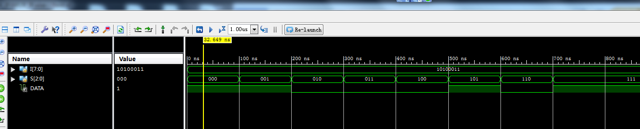 //8选1数据选择器,使用CASE语句 module MUX_8_1( input [7:0] I,//输入 input [2:0] S,//控制 output reg DATA //输出 ); always@(S) case(S)//控制 3'b000:DATA=I[0]; 3'b001:DATA=I[1]; 3'b010:DATA=I[2]; 3'b011:DATA=I[3]; 3'b100:DATA=I[4]; 3'b101:DATA=I[5];