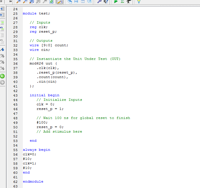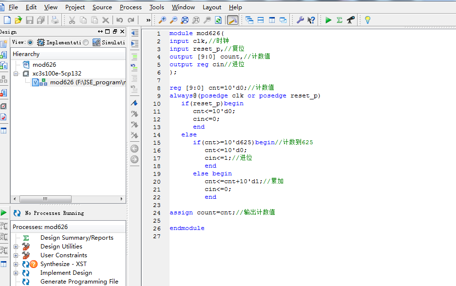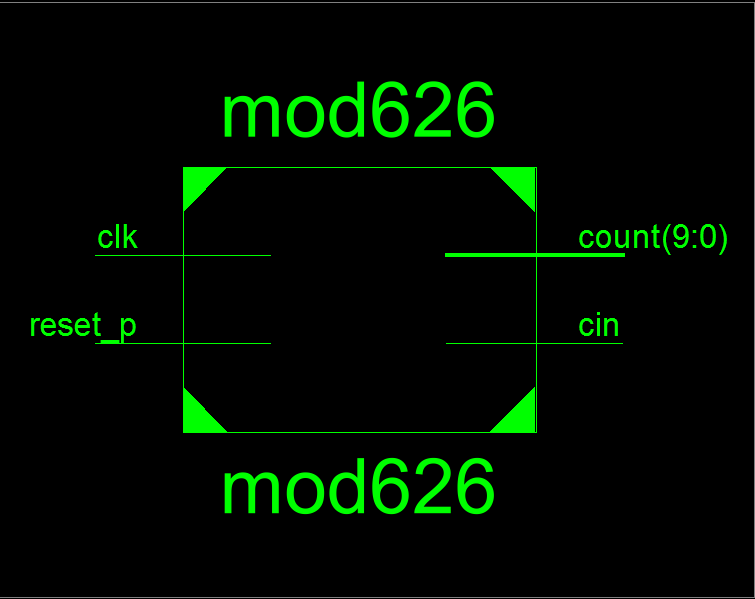 module mod626( input clk,//时钟 input reset_p,//复位 output [9:0] count,//计数值 output reg cin//进位 ); reg [9:0] cnt=10'd0;//计数值 always@(posedge clk or posedge reset_p) if(reset_p)begin cnt<=10'd0; cin<=0; end