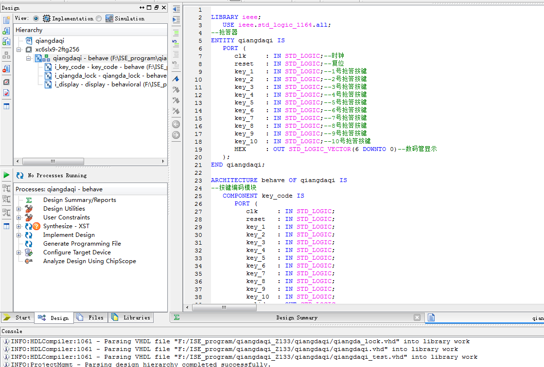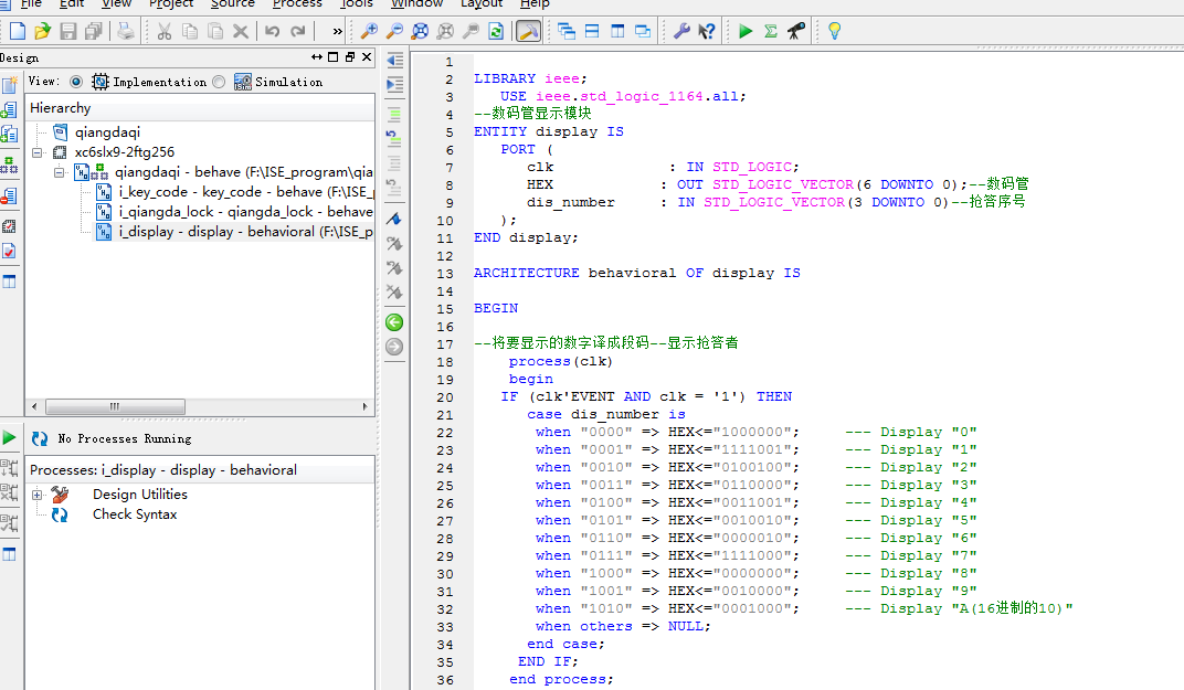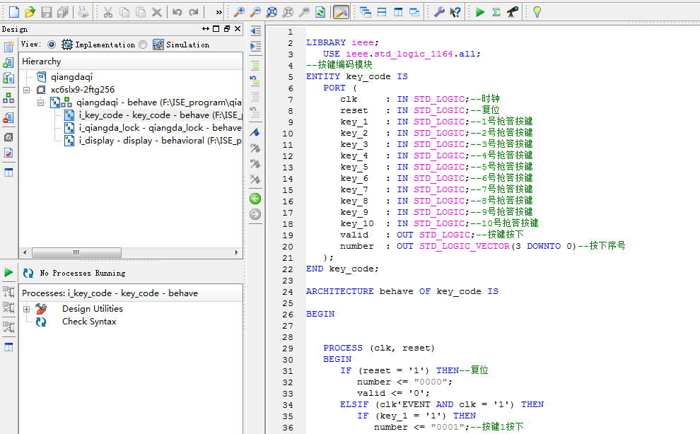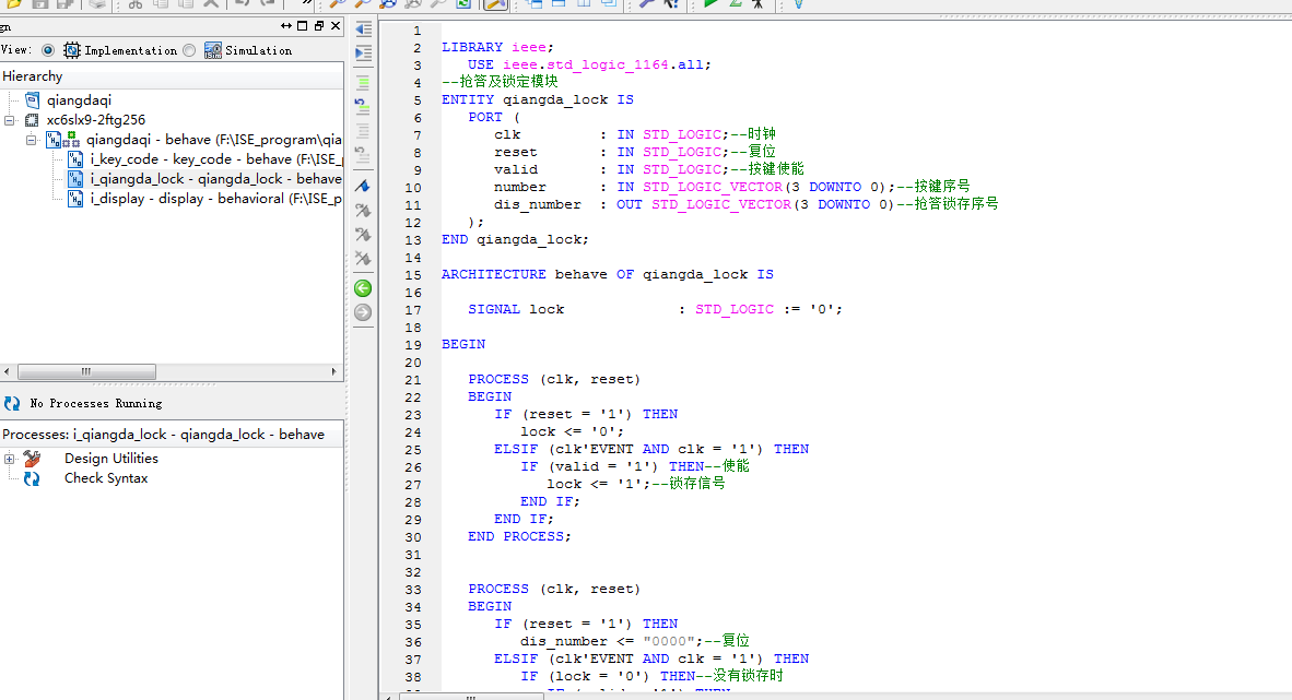 名称:基于FPGA的选手抢答器及结果显示驱动设计VHDL代码ISE仿真